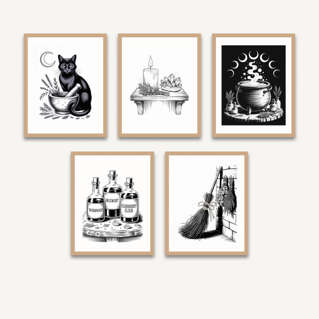 Printable Halloween wall art is an affordable way to create a festive look. Digital sets are inexpensive, easy to download, and instantly elevate blank walls into a seasonal focal point. Choose designs with black cats, cauldrons, potion bottles, herbs, or moon phases. Once printed, frame them with thrifted or dollar-store frames for a polished finish that costs much less than store-bought decor.