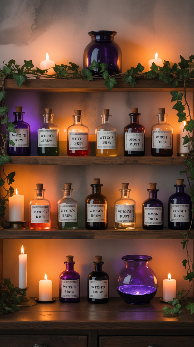 Picture This: Shelves lined with potion bottles labeled “Witch’s Brew” and “Moon Dust,” glowing under candlelight and ivy.