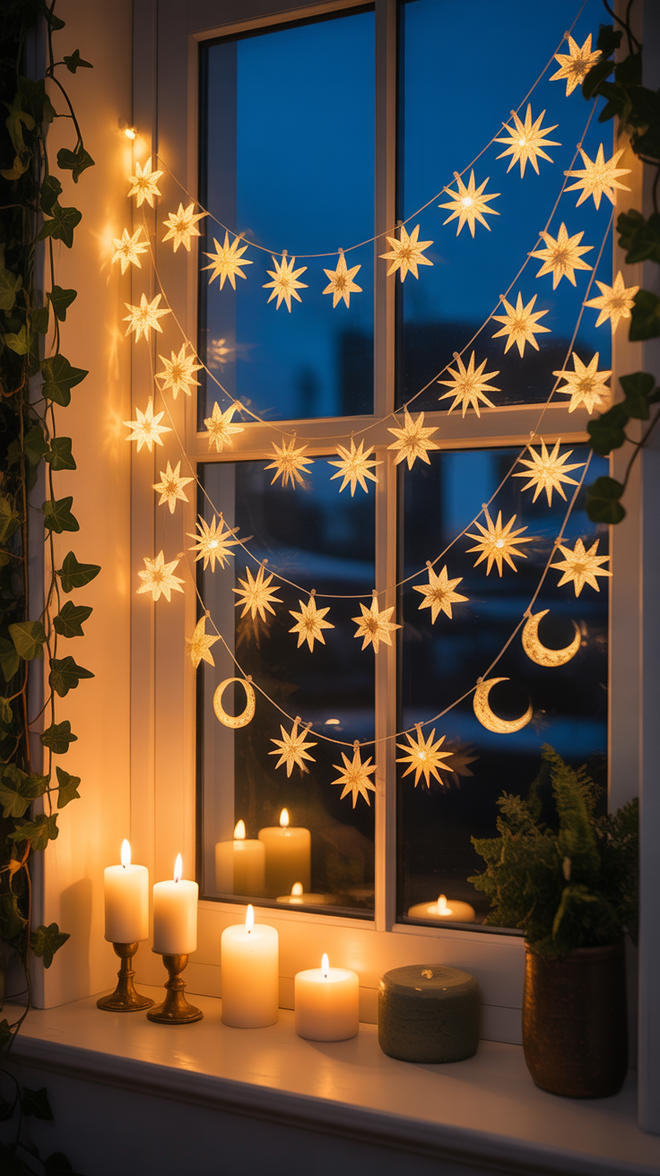 Picture This: A string of golden moons and stars draped across a window, glowing in candlelight with ivy nearby.