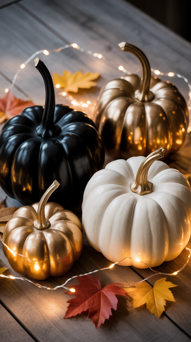 Picture This: A trio of painted pumpkins — black, gold, and white — surrounded by fairy lights and autumn leaves.