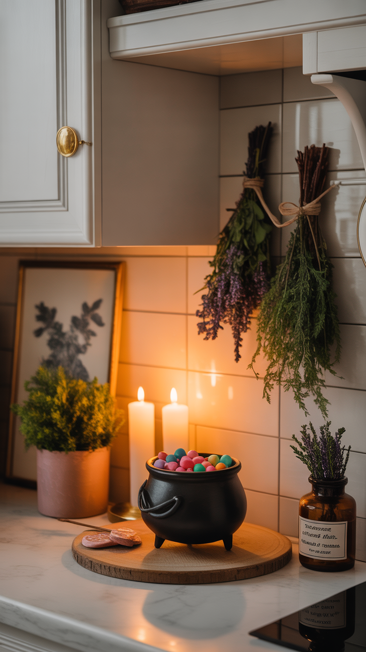 Picture This: A kitchen corner glowing with candles, a mini cauldron of candy, and herbs tied beside framed art.