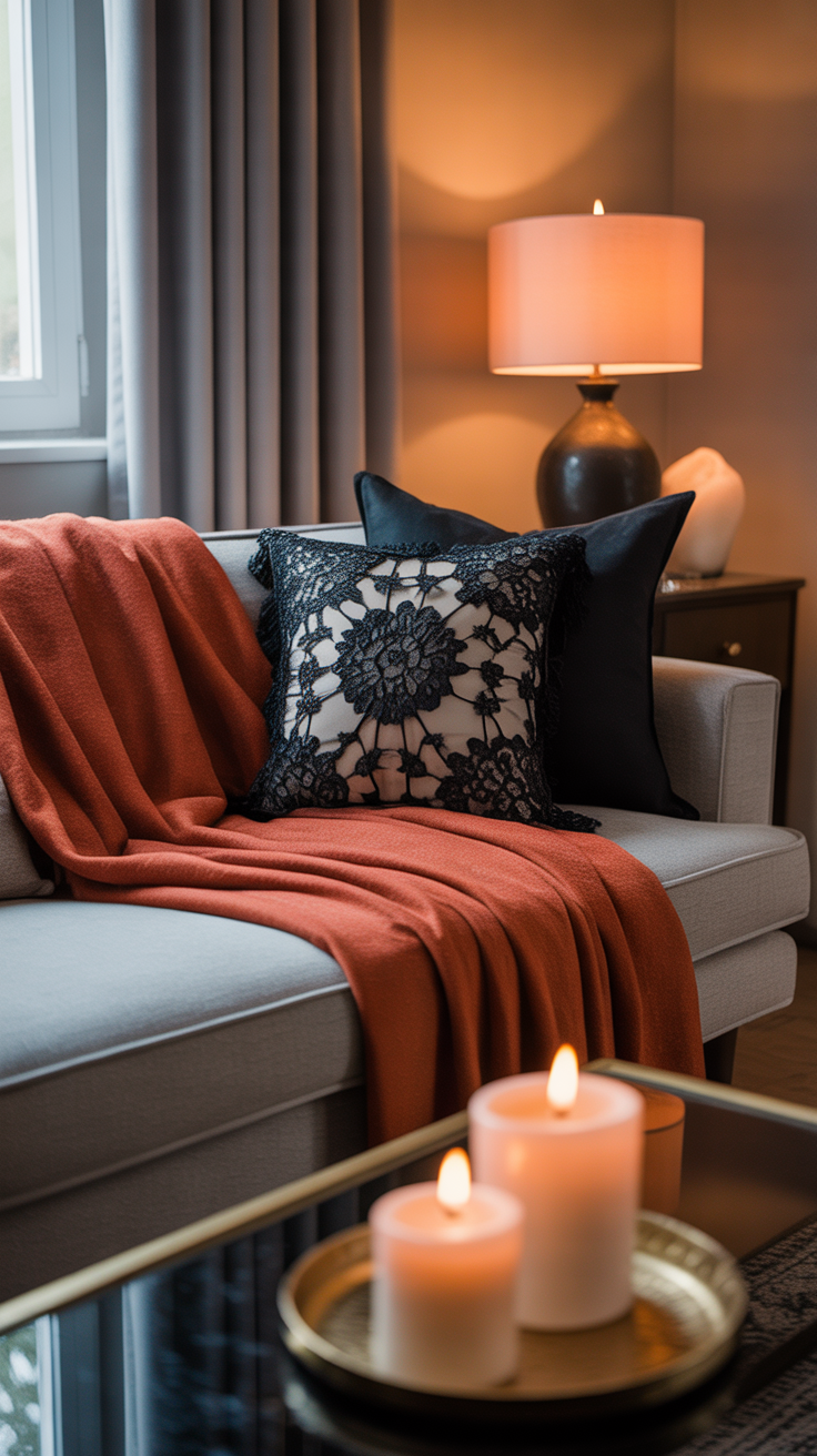 Picture This: A sofa draped with an orange blanket, accented by a black lace pillow, with candles flickering on the coffee table.