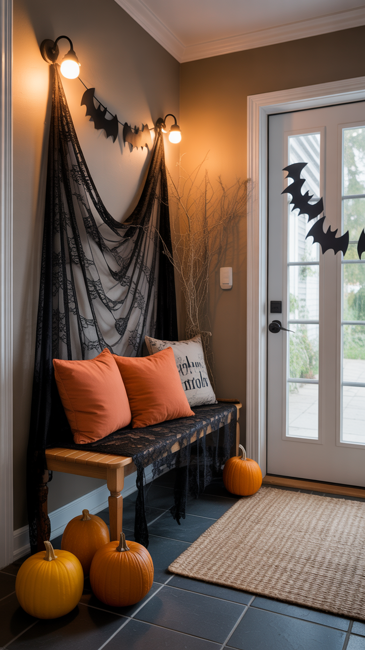 Picture This: A cozy entryway with a bench draped in black lace, orange throw pillows, pumpkins on the floor, and a simple bat garland above the door.