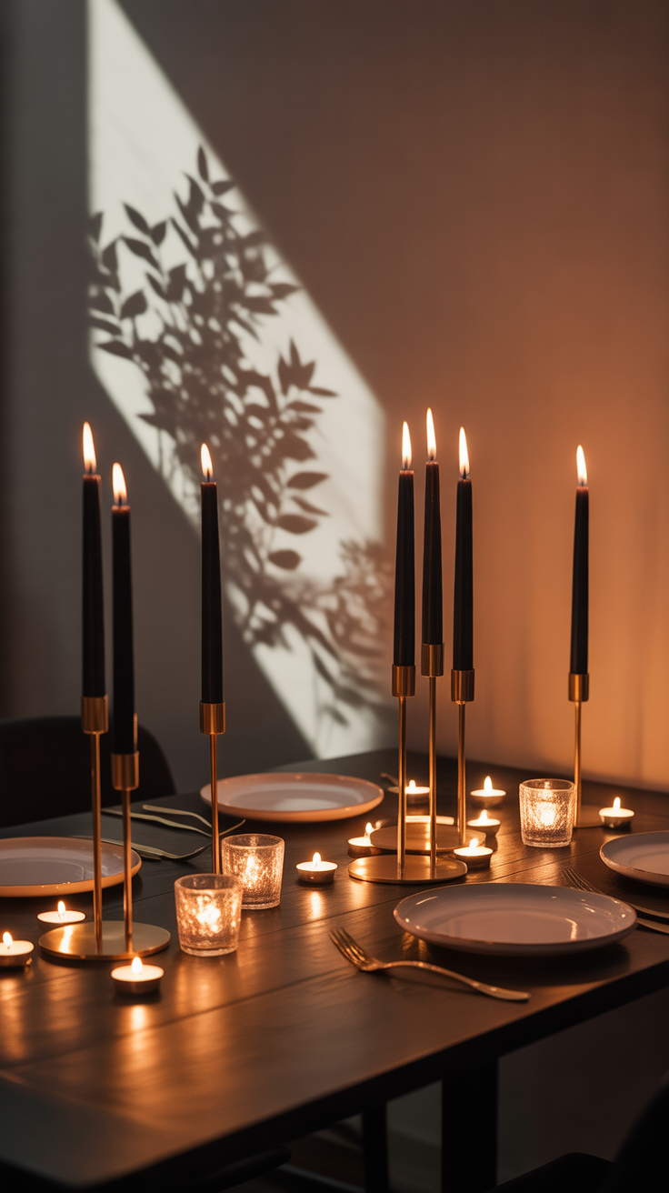 Picture This: A dining table glowing with black tapers in brass holders, tea lights scattered around, shadows dancing on the wall.