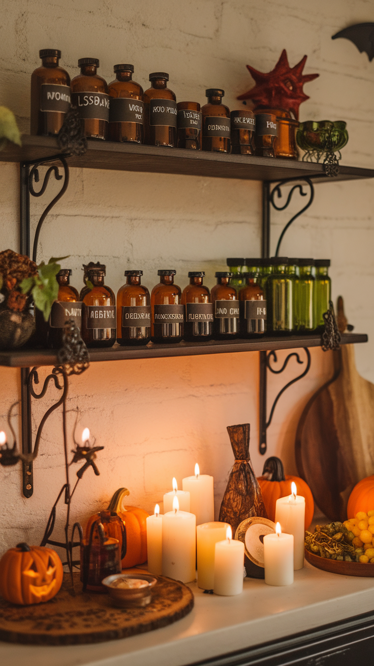 Potion bottles are the perfect blend of whimsy and practicality. Repurpose old glass jars by filling them with dried herbs, colorful spices, or tinted water. Add handwritten or printed vintage-style labels to complete the apothecary look. Display them on open shelving or near your tea station, and they’ll look like authentic spell ingredients straight from a grimoire.