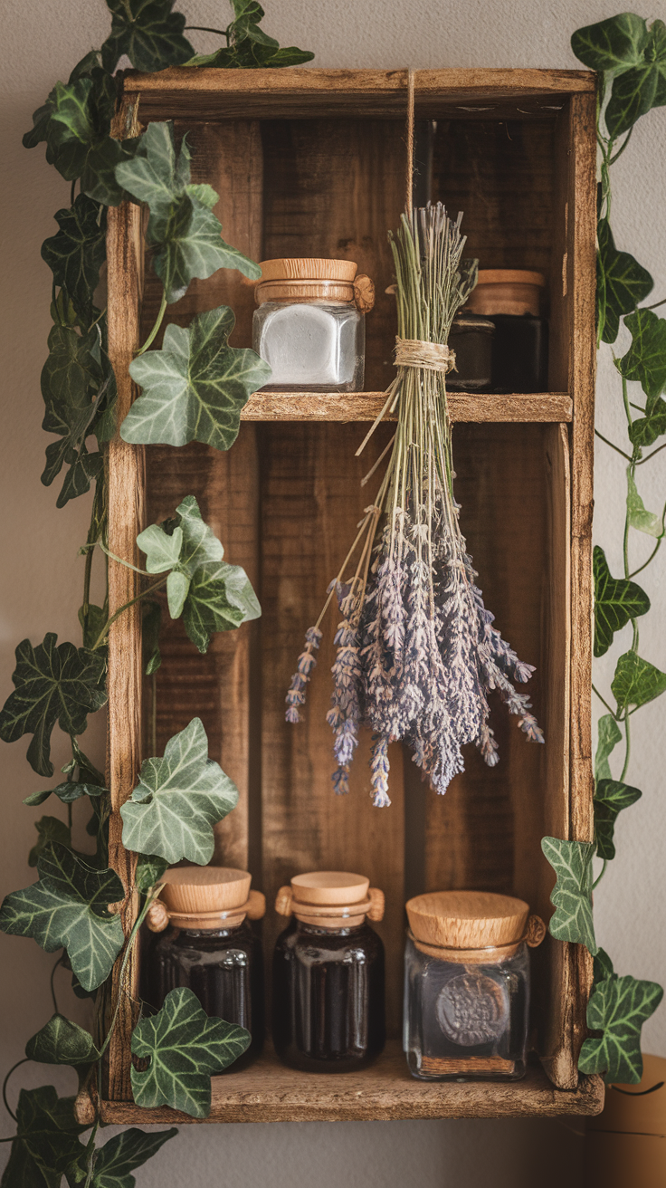 Picture This: A rustic shelf decorated with ivy trailing down one side, potion jars in the center, and a lavender bundle hanging gently beside them.