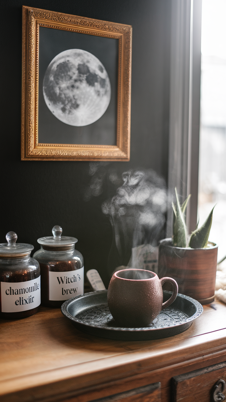 Picture This: A coffee station with potion jars labeled “Chamomile Elixir” and “Witch’s Brew,” a steaming mug on a tray, and a framed moon print overhead.