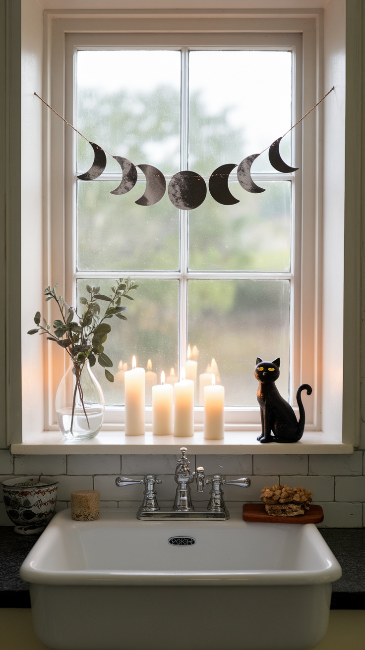 Picture This: A metallic moon phase garland draped across a window, a small black cat figurine perched beside the sink, glowing gently in candlelight.