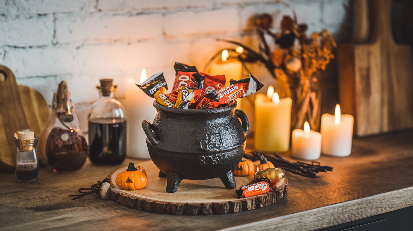 Picture This: A small black cauldron on the counter, glowing softly with fairy lights, surrounded by jars of herbs and spooky accents.